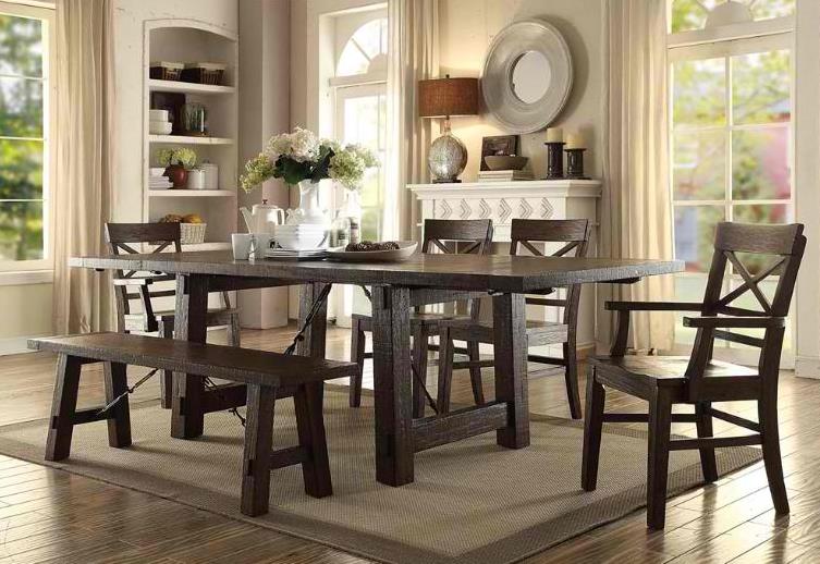Elevate your dining space with this Trestle Dining Table from Gettysburg Collection. Shown in a heavily distressed dark brown wood finish. Make a bold statement by incorporating this stunning furniture into your home.Read More