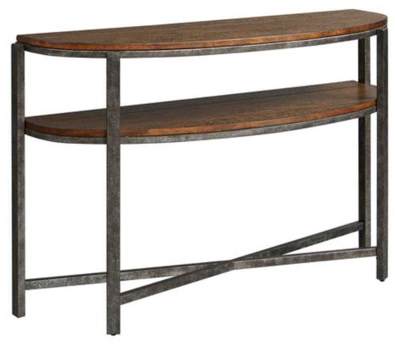 Elevate your space with the rustic style Breckenridge demilune sofa table. Crafted of metal tube and poplar veneers, this piece features a mahogany spice finish with pewter metal accents, appealing chattered planked top, a planked bottom shelf for additional storage, anchored by squared tube metal legs connected to a metal X stretcher. This simplistic style sofa table would be a wonderful accent piece in any home.Read More