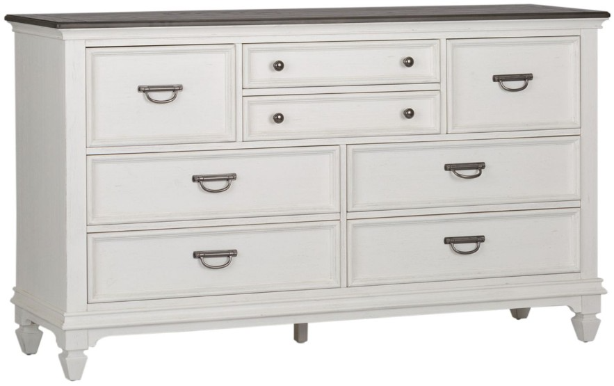 Create a classic cottage style with this dresser. The two-toned wire brushed white finish with charcoal top adds taste of vintage, allowing this piece to work from the mountains to an industrial loft. The charcoal top is accented by planks while the white base is highlighted by bead molding and antique pewter hardware.Read More