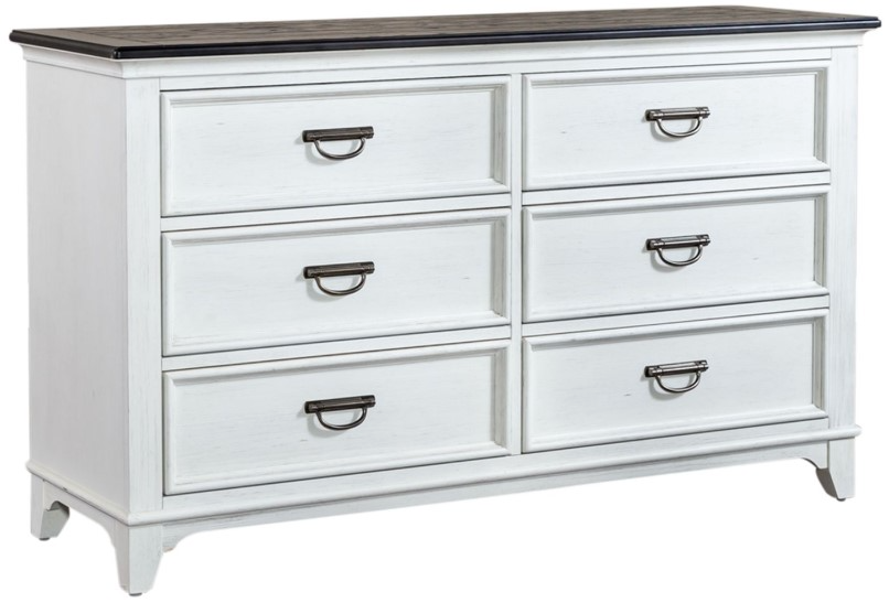 Create a classic cottage style with 6 drawer dresser. The two-toned wire brushed white finish with charcoal top adds a taste of vintage, allowing this piece to work from the mountains to an industrial loft. The charcoal top is accented by planks while the white base is highlighted by bead molding and antique pewter hardware.Read More