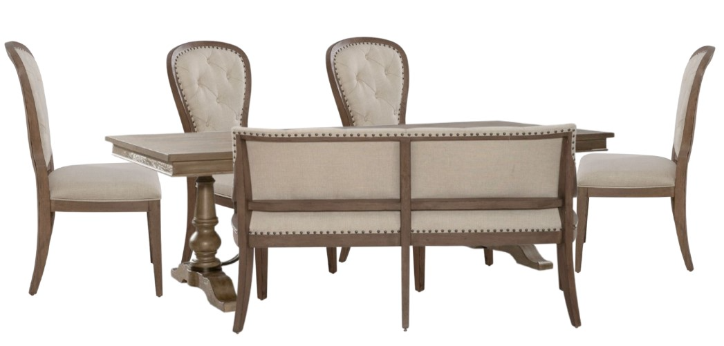 The trestle table has appealing bead molding along the apron and includes a 24” removable leaf. There is an elegant metal stretcher at the base of the table that connects to the splayed wooden feet. The upholstered tufted back chairs feature a gently shaped upholstered tufted back panel with exposed wood framing for a deconstructed feel. The upholstered shelter dining bench also has a tufted back panel with exposed framing. The upholstery is highlighted by nail head trim and tapered legs with nylon chair glides to protect your flooring. Americana Farmhouse evokes a style unconstrained and intended to be personal with an authentic craftsman’s flair and artistry.