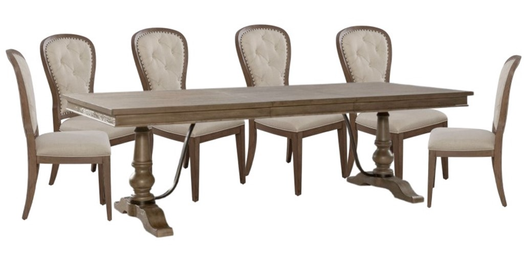 Be distinctively different with the Americana Farmhouse optional seven-piece trestle table set. Crafted of poplar and rubberwood solids with white oak veneers, this kit features a wire brushed dusty taupe finish with worm hole distressing and consists of the trestle table and six upholstered tufted back side chairs.Read More