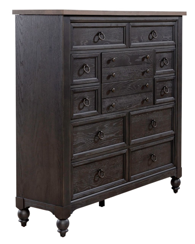 When details matter, choose the Americana Farmhouse 12 Drawer Chesser. Finished in a dusty black base, taupe top and accented with antique brass drop ring and knob pull hardware. All 12 drawers feature French & English Dovetail construction, wood framing with a beveled edge, and full extension drawer glides.Read More