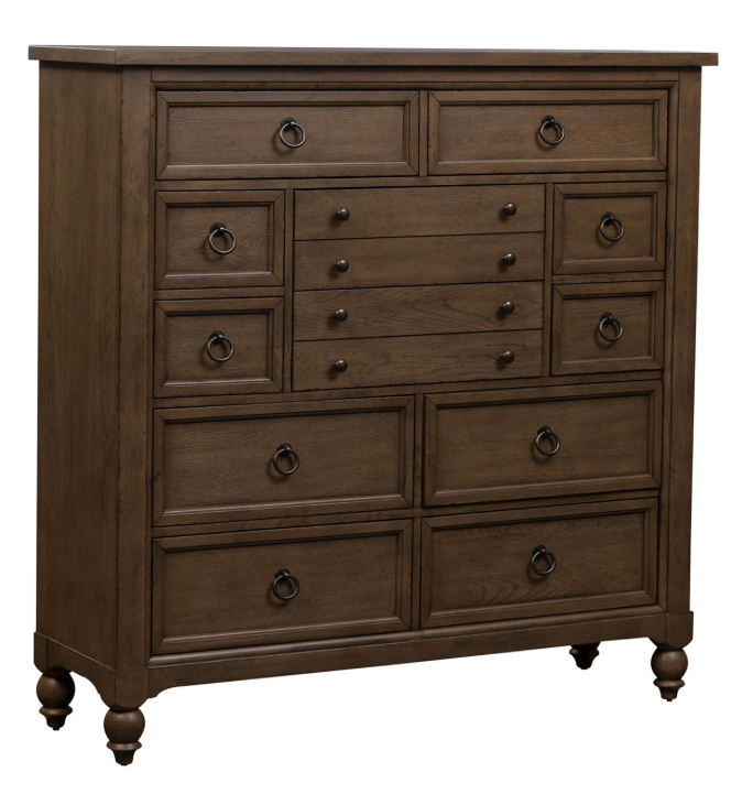 When details matter, choose the Americana Farmhouse 12 Drawer Chesser. Finished in a Dusty Taupe and accented with antique brass drop ring and knob pull hardware. All 12 drawers feature French & English Dovetail construction, wood framing with a beveled edge, and full extension drawer glides.Read More