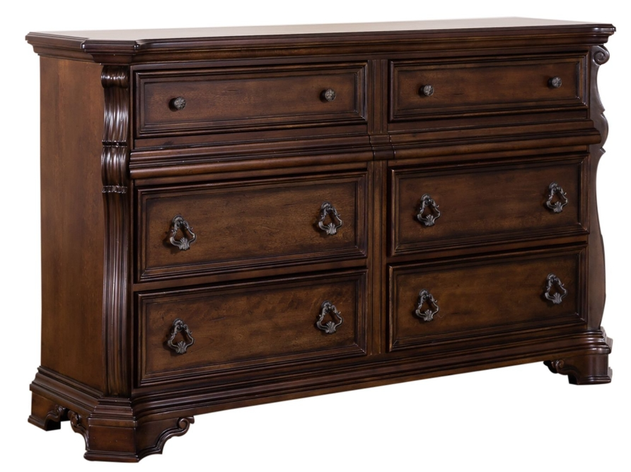 Add a statement piece to your room with this elegant 8-drawer dresser. The brownstone finish is accented by the burnished brass hardware as well as the four-way match fancy face veneer top. Organize your clothing using the 6 large drawers and 2 smaller hidden drawers, which are located beneath the top 2 drawers.Read More