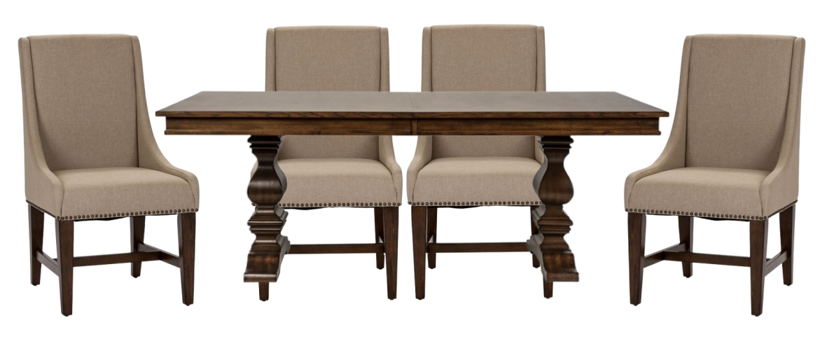 Create a grand gathering with the Armand five-piece trestle table set. Crafted of rubberwood solids with cathedral hickory veneers, this set features an antique brownstone finish and consists of the trestle table and four upholstered side chairs.Read More
