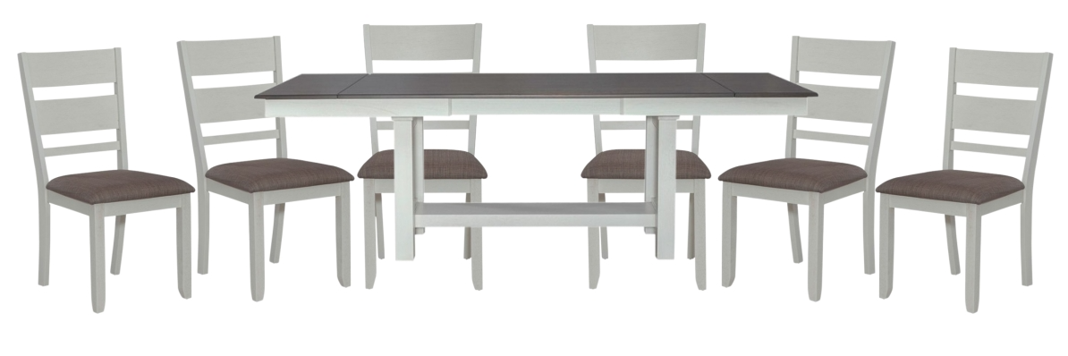 Feel at home with the Brook Bay optional seven-piece trestle table set. Crafted with excellence using rubberwood solids and mindy veneers, this set features a two-tone Carbon Gray and Textured White finish and consists of the trestle table and six upholstered slat back side chairs.Read More