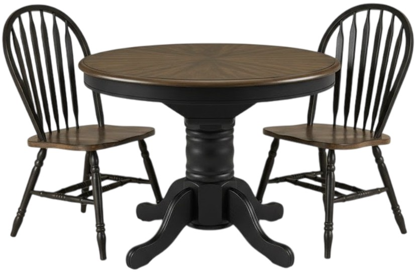 Reinvent your style with the Carolina Crossing three-piece pedestal table set. Crafted of rubberwood solids, this set features a heavily distressed antique honey and black finish and consists of a pedestal table and two Windsor back side chairs.Read More