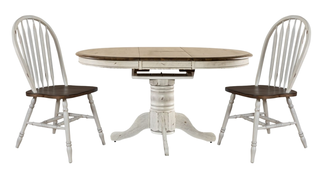Reinvent your style with the Carolina Crossing three-piece pedestal table set. Crafted of rubberwood solids, this set features a heavily distressed antique honey and white finish and consists of a pedestal table and two Windsor back side chairs.Read More