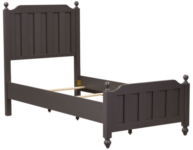 Fall into the cottage view panel bed at night. Crafted of melamine and a rubberwood solid frame, this piece features a dark gray finish, a square post bed with round finials and slat overlays, anchored by bun feet. Never question the reliability of this bed with the hook on rails and center supported slat system.Read More