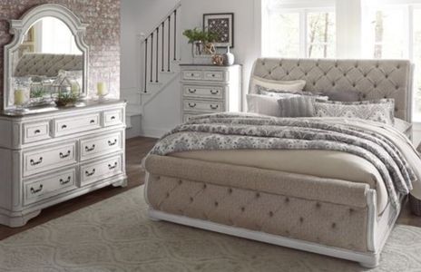 Opt for an elegant display. A refined yet relaxed feel describes the Magnolia Manor California king upholstered sleigh bed, dresser, mirror, and chest. Crafted of poplar solids with white oak and birch veneers, this kit features an antique white finish with heavy artistic chipping and weathered brown with whitewash tops.Read More
