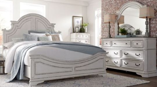 Opt for an elegant display. A refined yet relaxed feel describes the Magnolia Manor California king panel bed, dresser, mirror, and chest. Crafted of poplar solids with white oak and birch veneers, this kit features an antique white finish with heavy artistic chipping.Read More