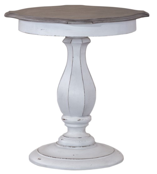 Accent your space with the traditional Magnolia Manor round accent table. Crafted of poplar solids with white oak and birch veneers, this piece features an antique white finish with a weathered brown with whitewash top, anchored by a turned pedestal base.Read More