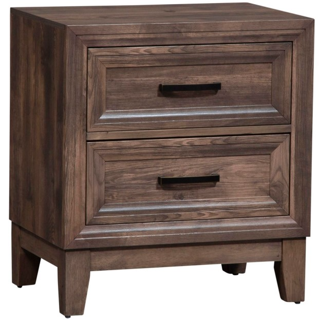 Enhance any room with this urban Ridgecrest two drawer night stand. Crafted by rubberwood solids and paper laminate, this piece features paper drawer interiors, bottom case dust proofing and antique brass bar pull hardware, all seamlessly anchored by the tapered leg base.Read More