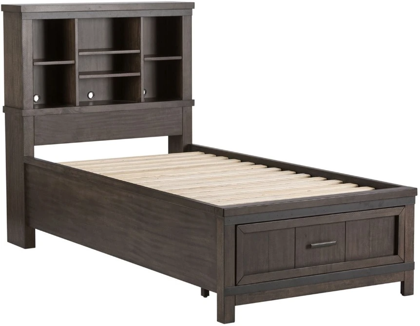 Add a natural feeling to your living space using the Thornwood Hills bookcase bed. Crafted with rubberwood solids and mango veneers, the rock beaten gray finish is highlighted by saw cuts and hammered metal strip accents across the bookcase headboard and storage footboard.Read More