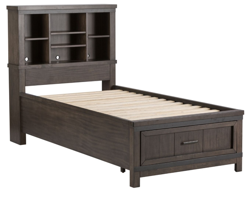 Add a natural feeling to your living space using the Thornwood Hills bookcase bed. Crafted with rubberwood solids and mango veneers, the rock beaten gray finish is highlighted by saw cuts and hammered metal strip accents across the bookcase headboard and storage footboard.Read More