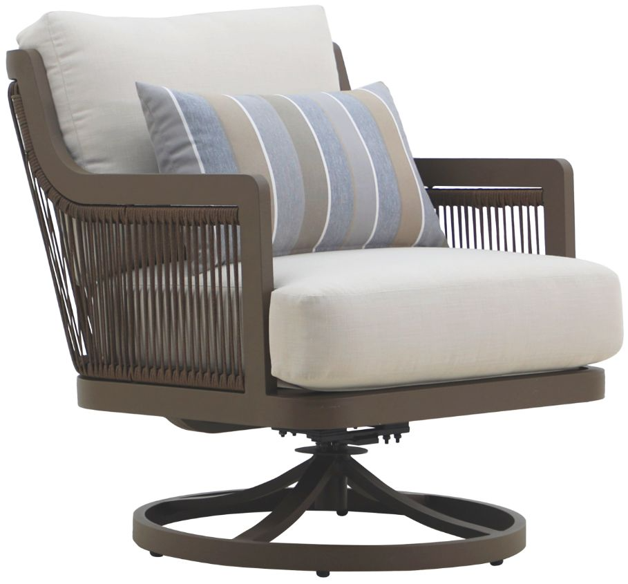 The Genova Patio swivel club chairs with accent pillows offer the perfect balance of durability, comfort, and function for your outdoor seating area. Crafted with durable aluminum frames and a baked-on powder coat, these chairs provide superior scratch resistance and long-lasting performance.Read More