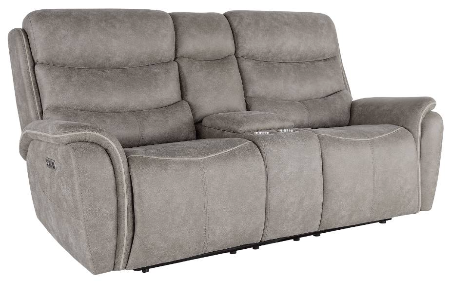 Experience the epitome of luxury and relaxation with the Kamari reclining console loveseat with power headrests and footrests in gray. Crafted from a blend of polyester and PU fabric, its suede-like upholstery offers sumptuous softness and easy maintenance. Tailored with triple roll backs and wrap-around arms, this loveseat exudes sophistication.Read More
