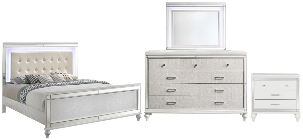 The Valentino 4-Piece Bedroom Set delivers a blend of elegance and modern design. Featuring a spacious king bed, a chic dresser, a matching nightstand, and a refined mirror, this set enhances your bedroom with its clean white finish and functional storage solutions.Read More