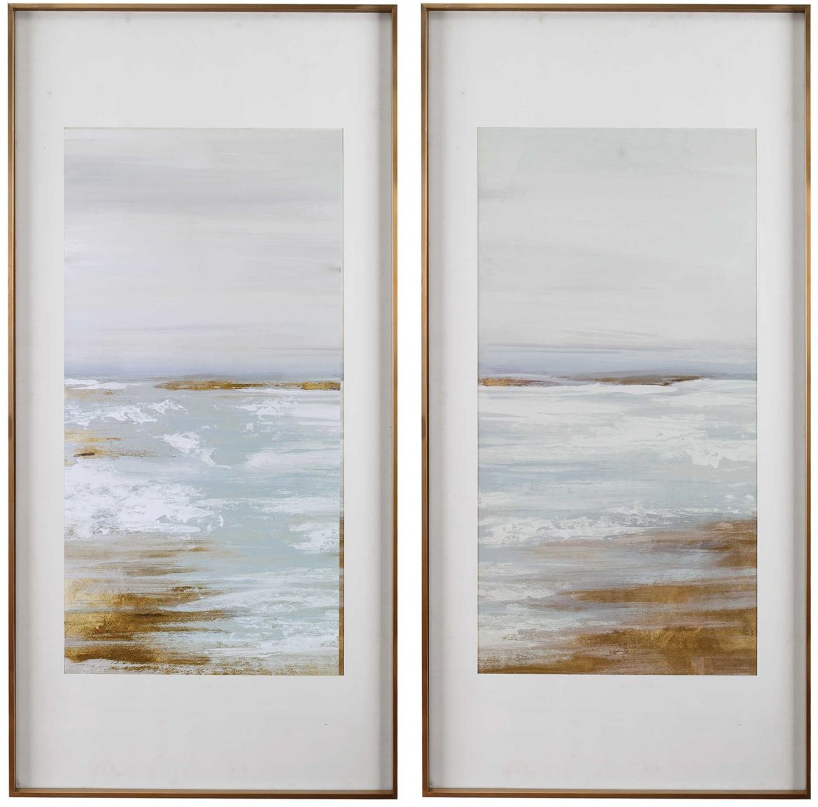 These refined coastal prints are an abstract take on a waterfront scene. Light blue and gray tones are highlighted by rust brown and gold accents. Each image is placed under glass with a brushed gold frame and large white mat.Read More
