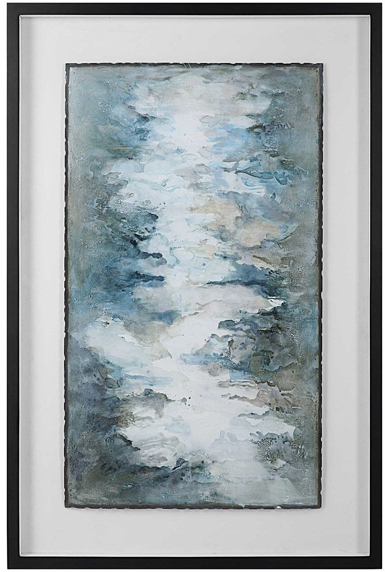 Hand painted on a metal sheet, this contemporary artwork features shades of silver leaf, blue-green and white. Each piece is placed under glass in a black shadow box style frame against a white background. Due to the handcrafted nature of this artwork, each piece may have subtle differences.Read More
