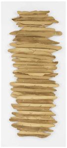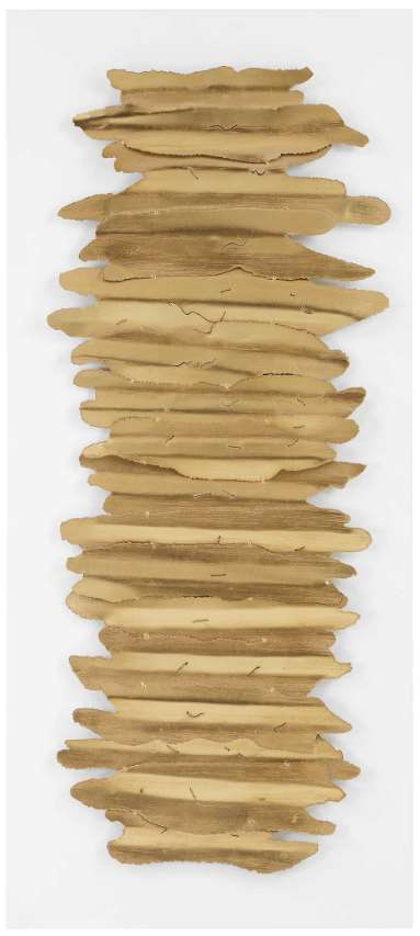 Iron wall art featuring layers of metal strips with crude edging finished in an antique gold leaf and set on a matte white iron backing. May be hung horizontally or vertically.Read More